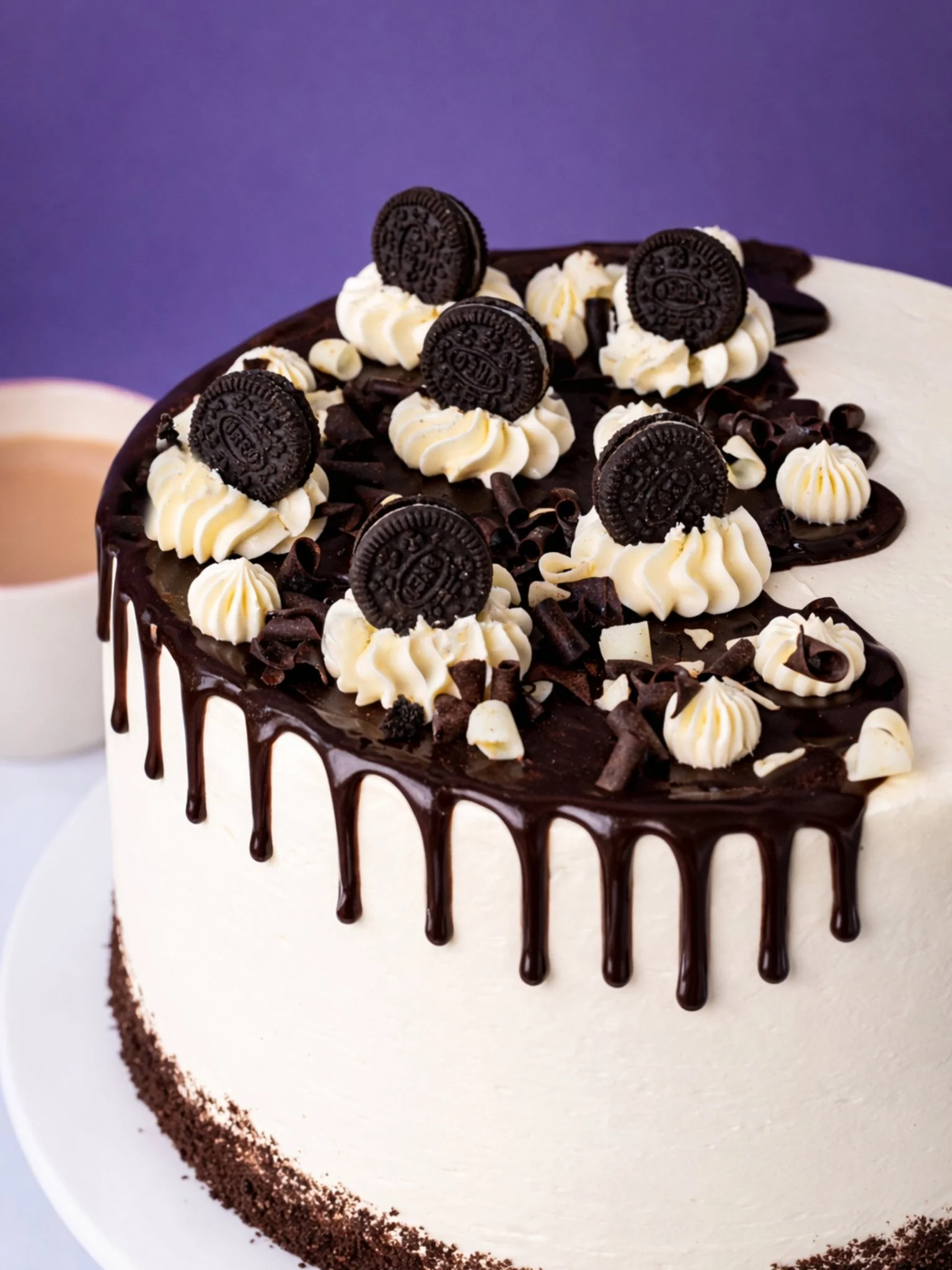 Playful, Decadent Decorations: Finished with cookie crumbs, buttercream piping, mini Oreo cookies, and elegant white and dark chocolate curls — adding texture, height, and irresistible detail.