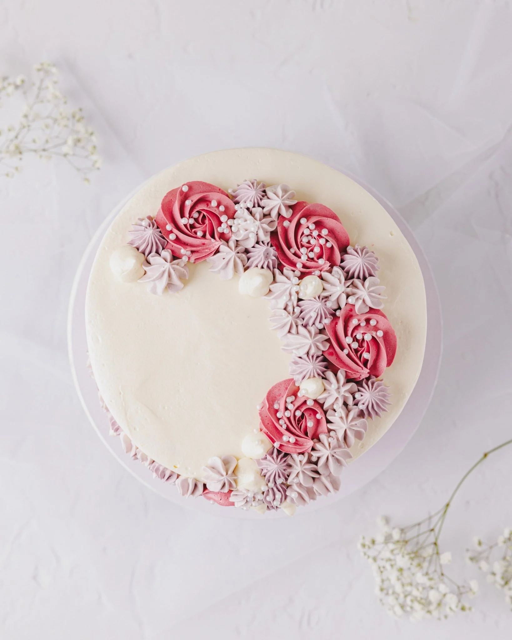 - Coated in Lavender & Lilac Swiss Meringue Buttercream – A stunning ombre effect in soft, dreamy tones.