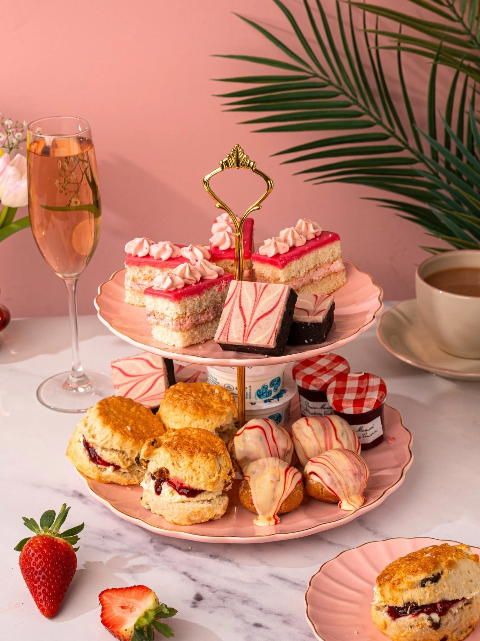 Indulge in the perfect rosé wine gift hamper, beautifully curated with a mini bottle of rosé and an irresistible selection of strawberry-inspired sweet treats. This luxury hamper includes strawberries and cream mini slices, rich cherry brownies, delicate strawberry cream choux, and freshly baked plain and fruit scones, served with mini jam pots and traditional clotted cream.